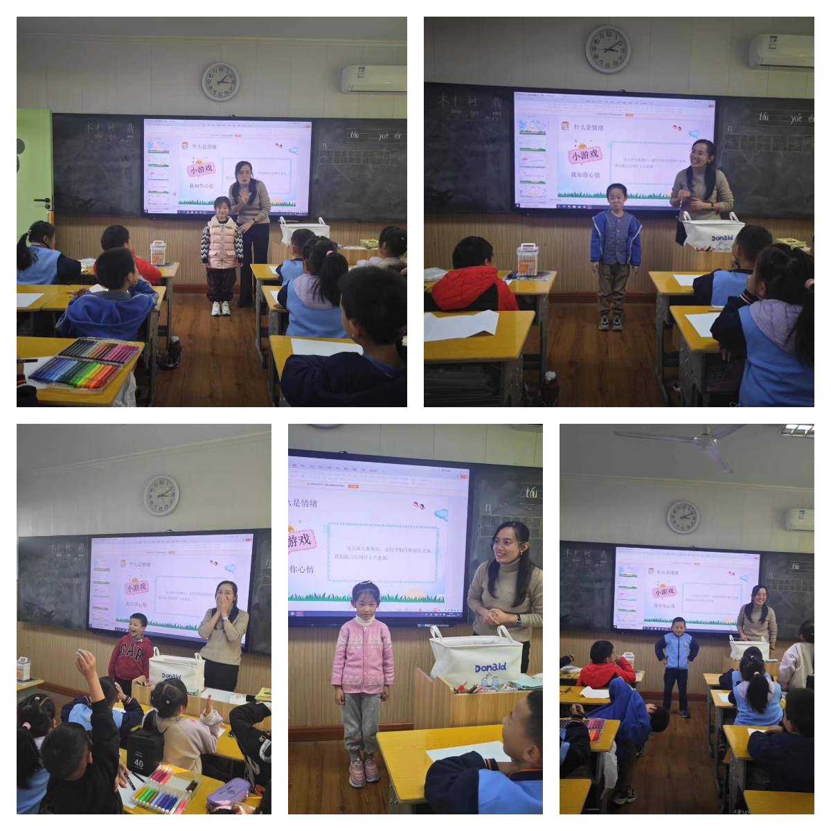 一开场,先玩了一个“我表演你来猜”的小游戏,选出5名同学上台,通过面部表情和肢体语言来展示不同的心情,让其他同学猜测他们所表达的是哪种心情,从而引出情绪的概念。